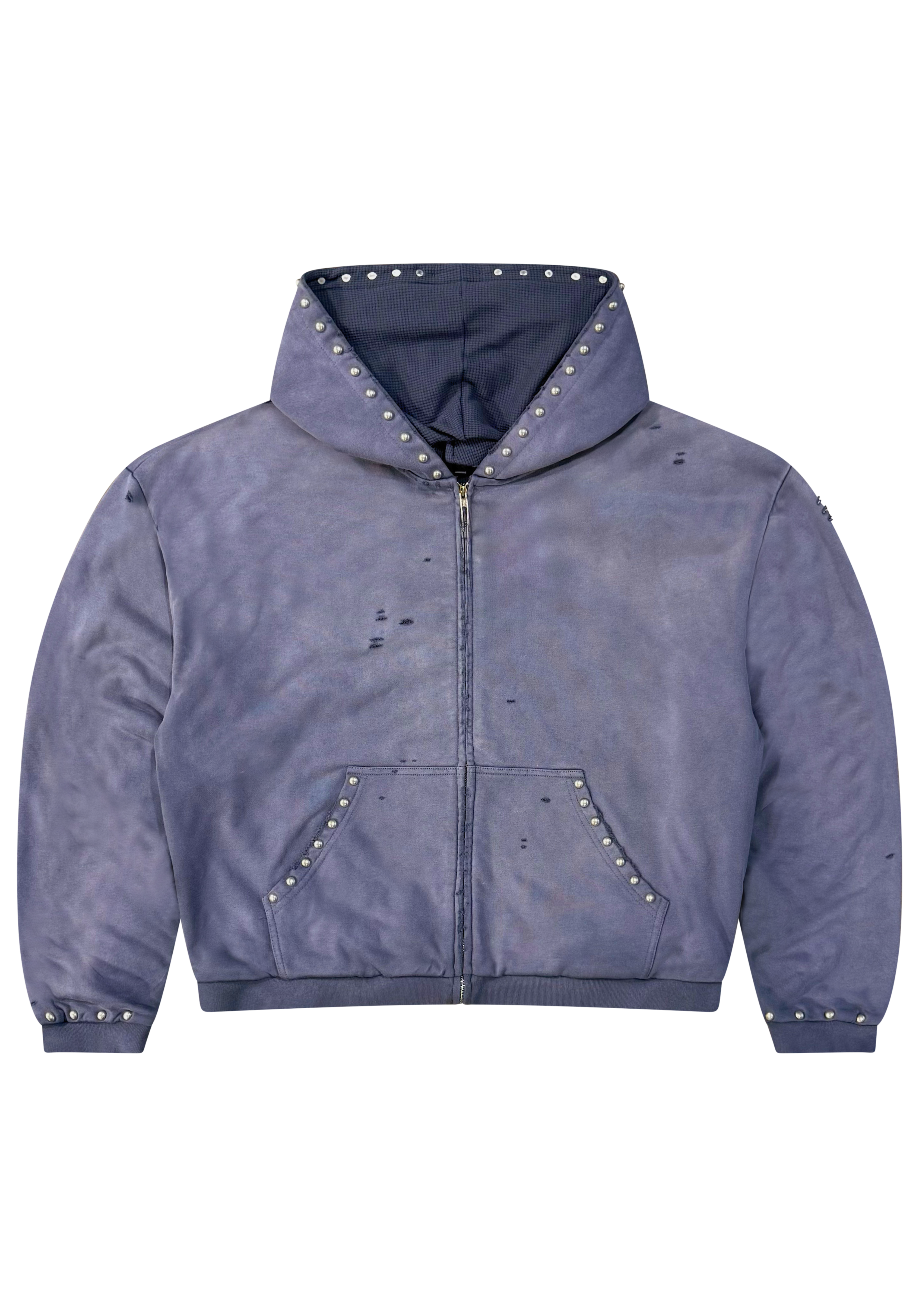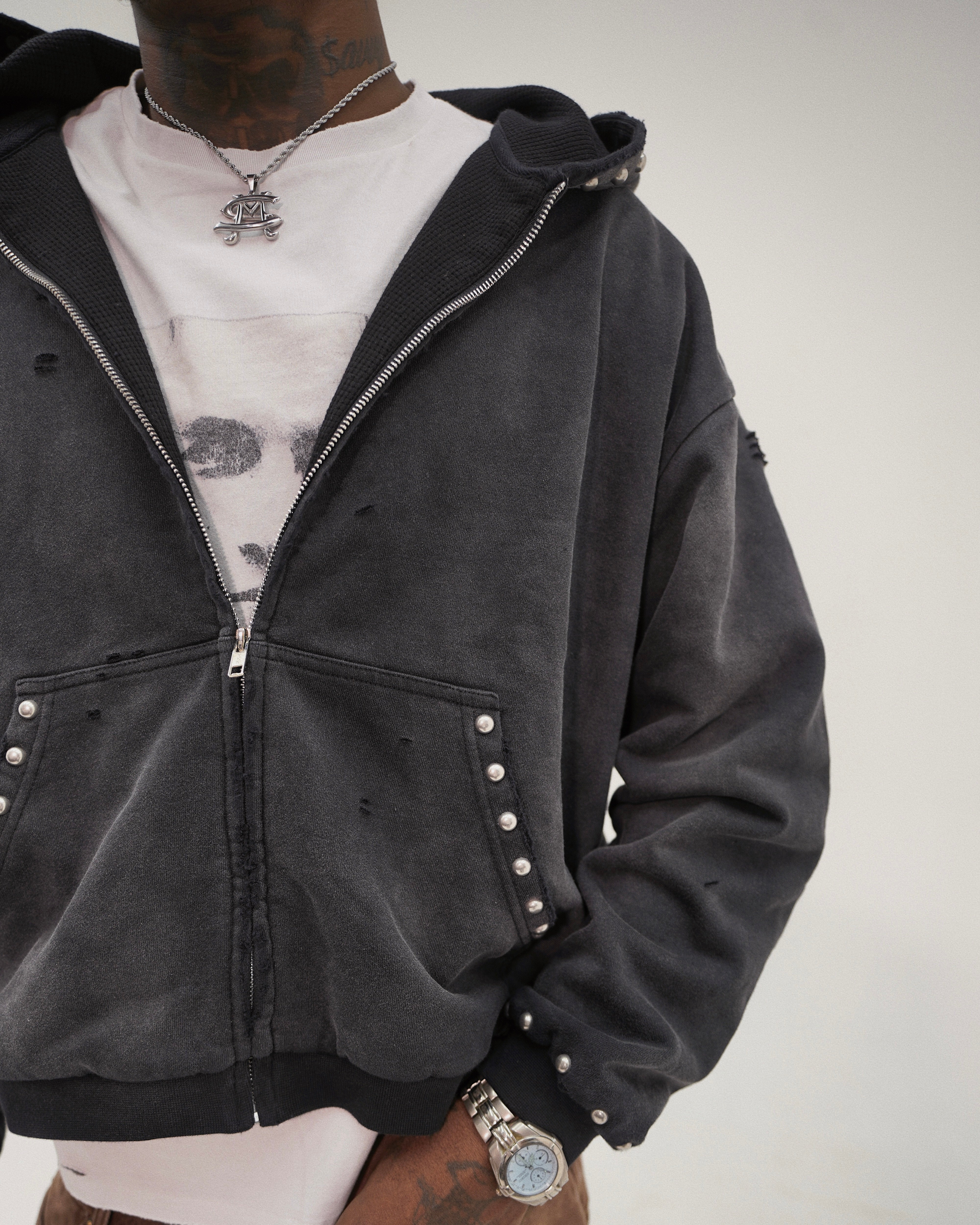 SILVER RIVETS ALONG POCKET, CUFF, & HOOD
